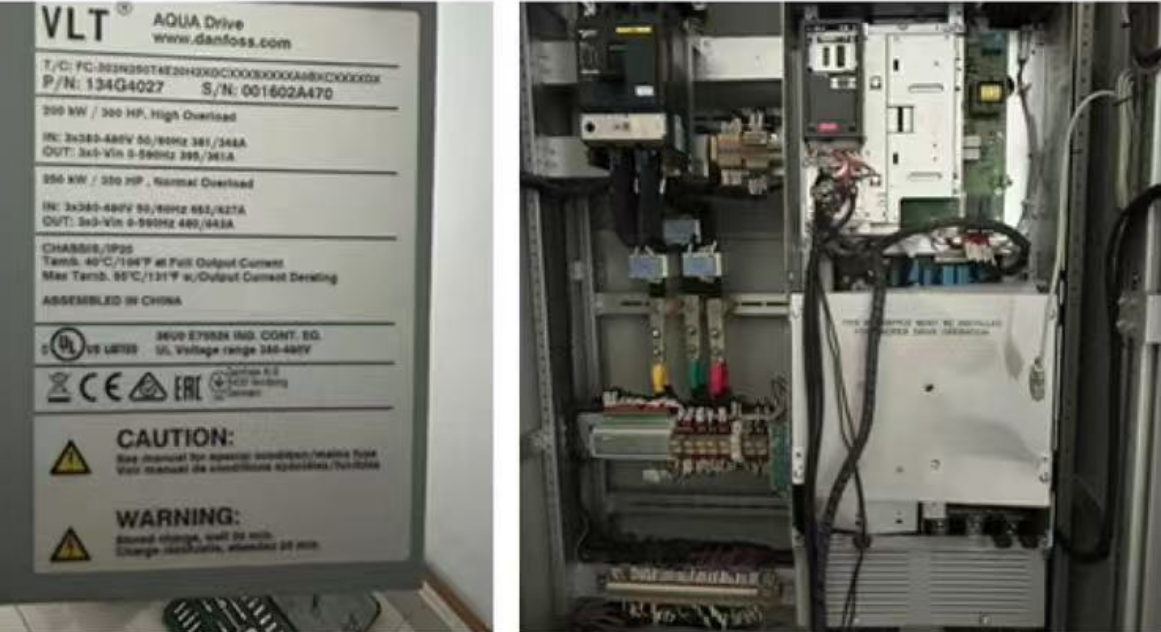 丹佛斯FC202是丹佛斯AQUA專用變頻器,是一款專用于水處理領(lǐng)域的變頻器,具備諸多適配水行業(yè)工況的特性與優(yōu)勢(shì)。由于用戶現(xiàn)場(chǎng)使用的是 200KW 潛水泵,且無(wú)法獲取電機(jī)參數(shù),所以上海津信維修人員首先對(duì)變頻器參數(shù)進(jìn)行了調(diào)整,增大了電機(jī)額定電流。重新帶電機(jī)運(yùn)行后,變頻器能夠上升至 45Hz,但隨后再次報(bào)出電流超限故障,并且電機(jī)發(fā)出異常聲響,呈現(xiàn)出明顯的缺相特征。?