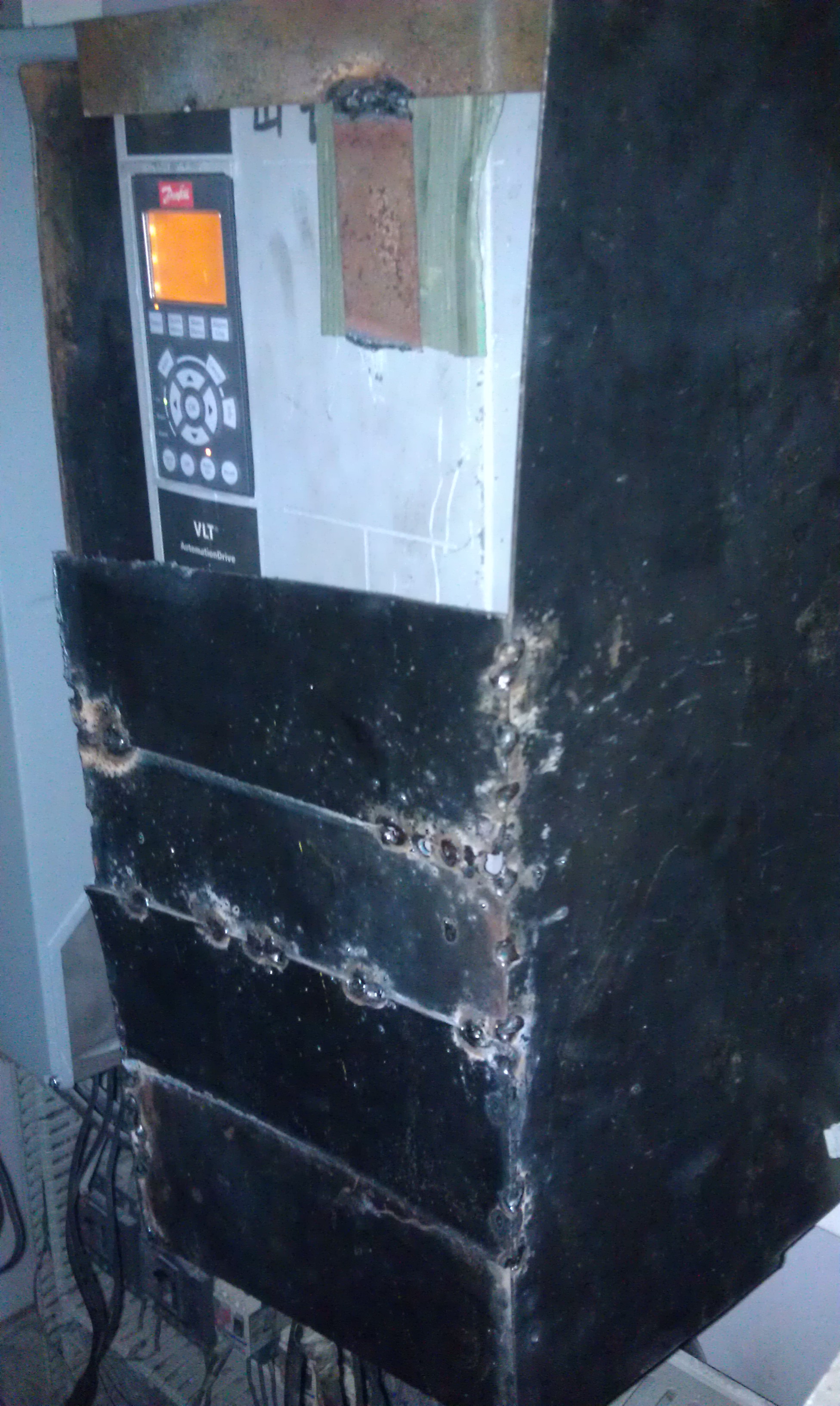 最后通過以上分析,現(xiàn)場服務(wù)工程師決定對新變頻器做一個磁場屏蔽的實驗,做一個鐵的環(huán)形屏蔽,如圖所示,設(shè)備重啟后馬上就運行正常了,并且連續(xù)運行了16個小時,期間無任何故障報警,一切運轉(zhuǎn)正常。